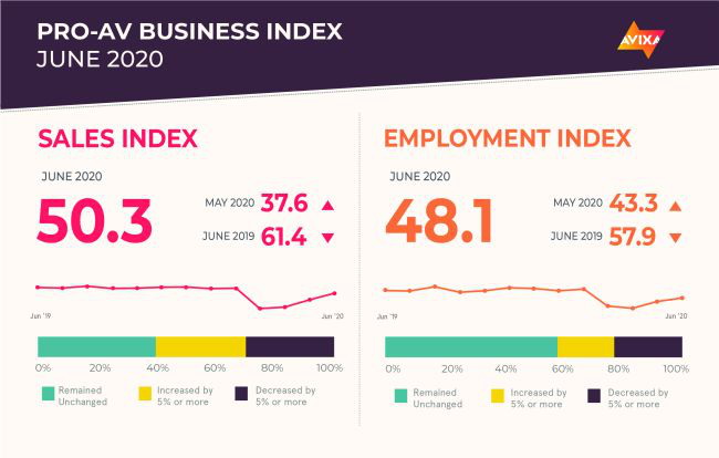 專業音視頻的就業開始顯示出勞動力市場的轉機。AV職業指數得分為48.1,表明處于中立狀態。比上個月上升了5點。AVIXA預計就業指數將在7月份進入增長領域。