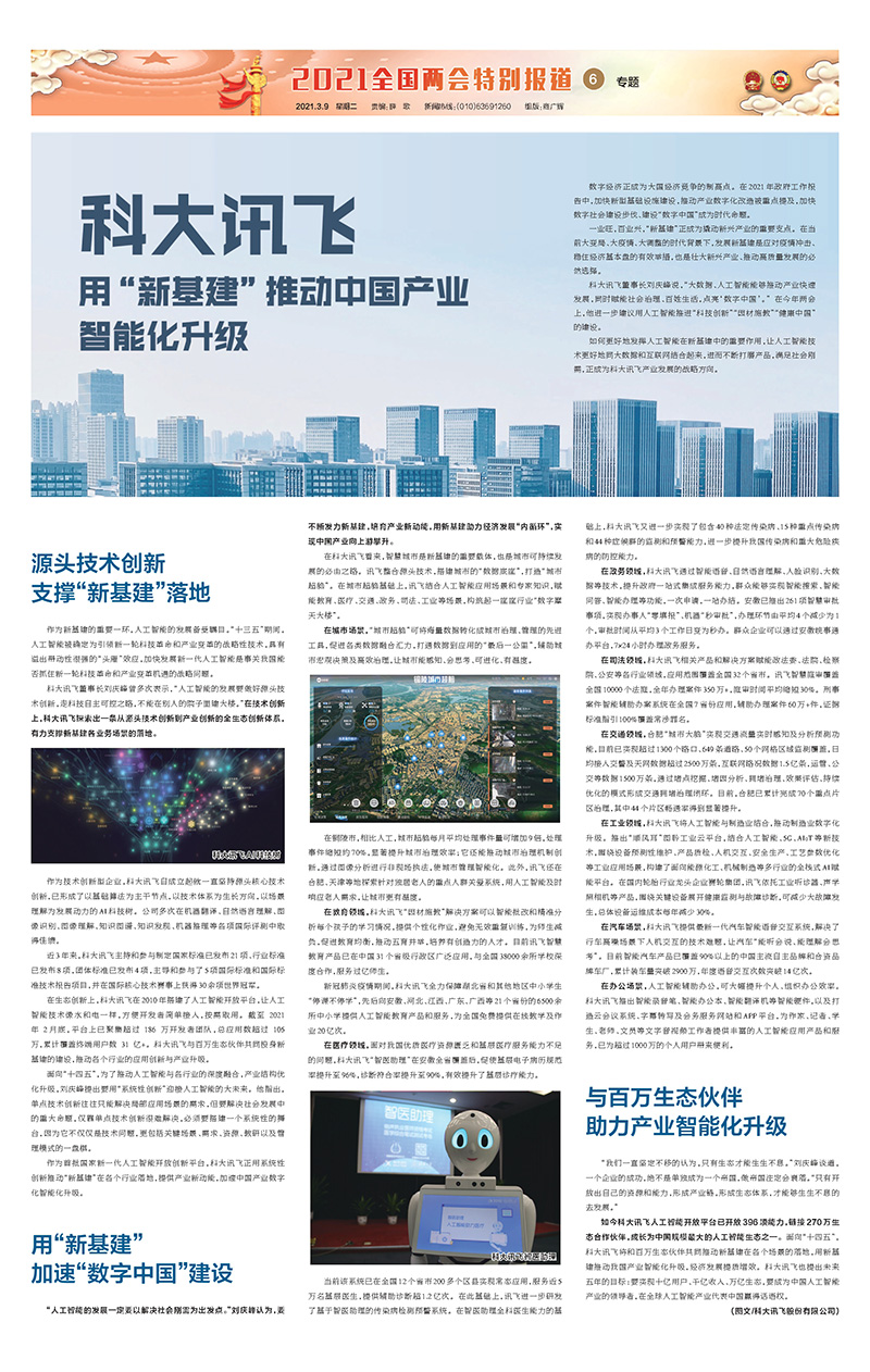 作為首批國家新一代人工智能開放創(chuàng)新平臺,科大訊飛正用系統(tǒng)性創(chuàng)新推動“新基建”在各個(gè)行業(yè)落地,提供產(chǎn)業(yè)新動能,加速中國產(chǎn)業(yè)數(shù)字化智能化升級。