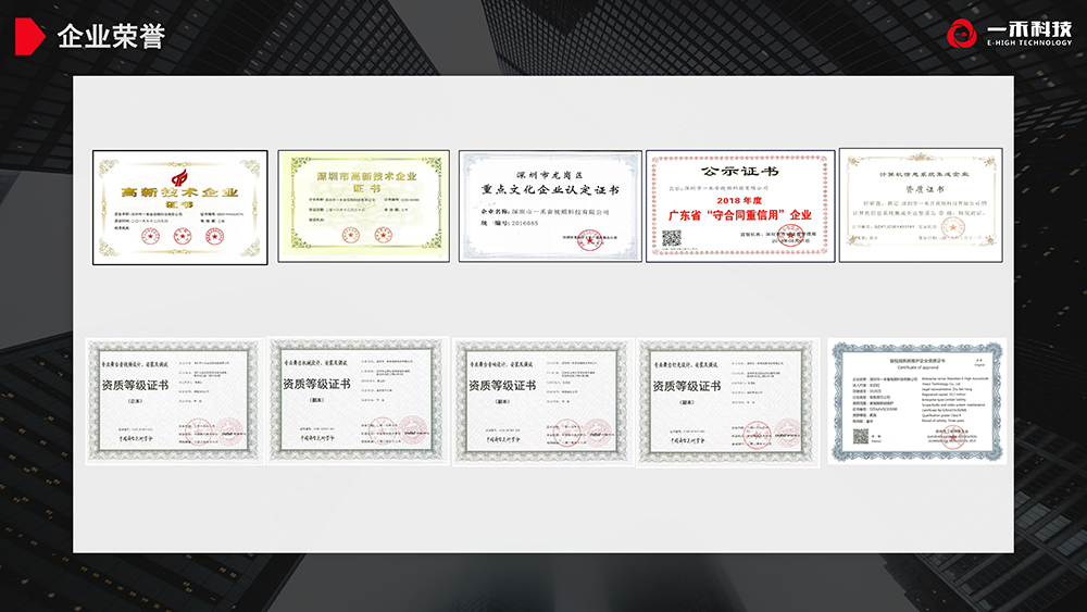20年的音視頻行業(yè)經(jīng)驗(yàn)積累,獲得多項(xiàng)企業(yè)榮譽(yù)資質(zhì),行業(yè)項(xiàng)目施工資質(zhì),產(chǎn)品榮獲多項(xiàng)榮譽(yù)證書。
